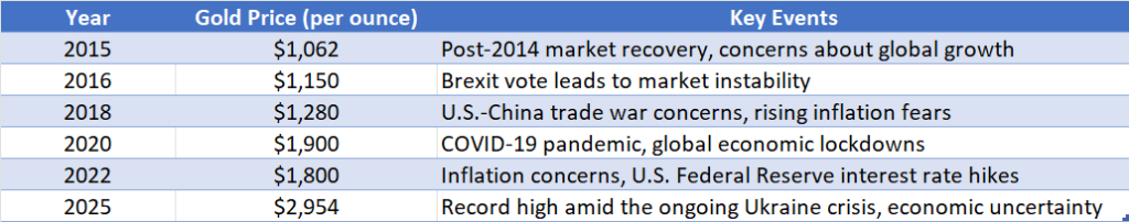 Gold’s steady price rise from 2015 to 2025, with notable surges during geopolitical events such as Brexit, the U.S.-China trade war, and the COVID-19 pandemic, reflects its resilient nature as a safe haven.